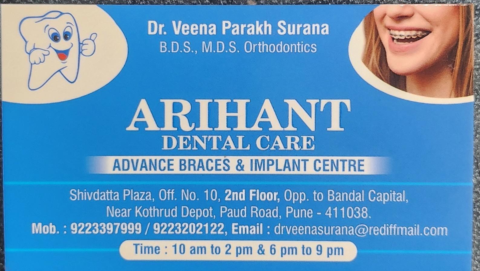 Your SMILE is Our Priority. Achieving pleasant , confident smile is easier than you think. Arihant dental clinic is center for advanced dentistry and invisible Braces. We are designing smiles since 2018. Dr Veena Surana at Arihant dental clinic,Pune offers all variety of orthodontic treatment plans to ensure you healthy and beautiful smile. Dr Veena is MDS,Orthodontics -12 year of experience . She is expertise in managing complex cases. His innovative approach to orthodontic treatment and use of advanced technology(Aligners) had helped him to transform smile of thousands of patients. Provides variety of orthodontic treatment including cost effective alternatives to traditional Braces and Aligners. Arihant dental care believe in high quality dental care accessible to everyone in pune ensuring every patient to enjoy beautiful,healthy smile